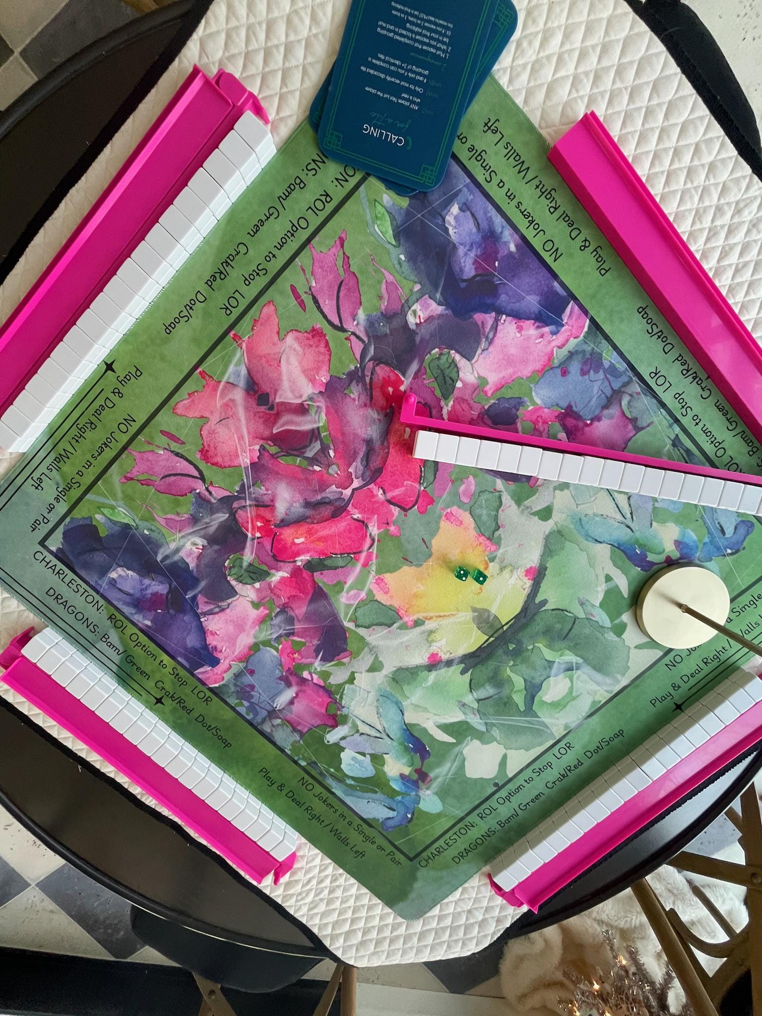 Bold, expressive, and unmistakably artistic, this vibrant ink floral abstract Mahjong mat features layered washes of greens, pinks, and purples in a dynamic mirrored composition. Designed from original artwork and thoughtfully integrated with easy-to-read game guidelines printed directly on the mat, it transforms your table into both a functional playing surface and a statement piece.