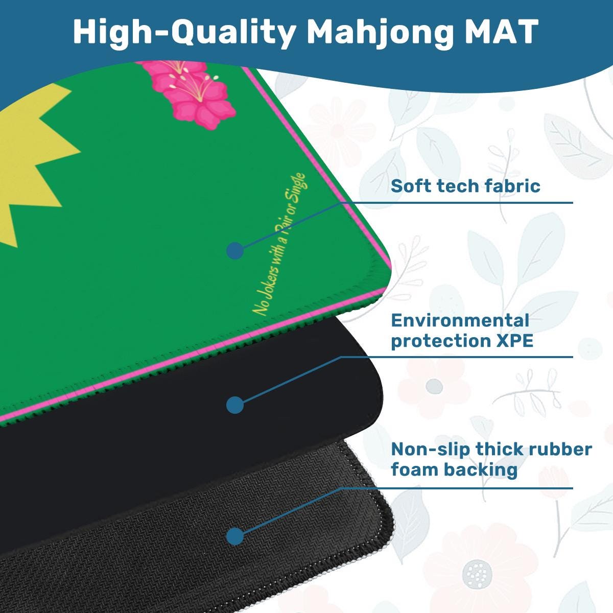 - Premium Quality: Made from durable polyester with a non-slip backing to eliminate movement. Generous Size: 31.5" x 31.5" square, 3mm thick for a comfortable and stable playing surface. Noise-Reducing & Table-Protecting: Smooth, soft top reduces tile clatter and stops table scratches. Complete Set: Includes Mahjong mat & storage bag.